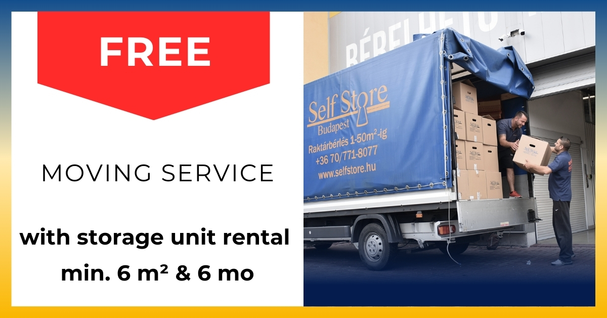 🚚Free moving service: you can take advantage of our free moving service in Budapest when you rent a new storage unit at any of our facility. Rent a minimum of 6 m2 of storage space for at least 6 months and pay for the first 3 months in one lump sum. Our experienced movers will transport your belongings free of charge at a pre-arranged time and pack them into your storage unit. When requesting a quote, select the appropriate building(s) and size range, then write in the comments field that you would like free transport. The promotion is valid until withdrawn.